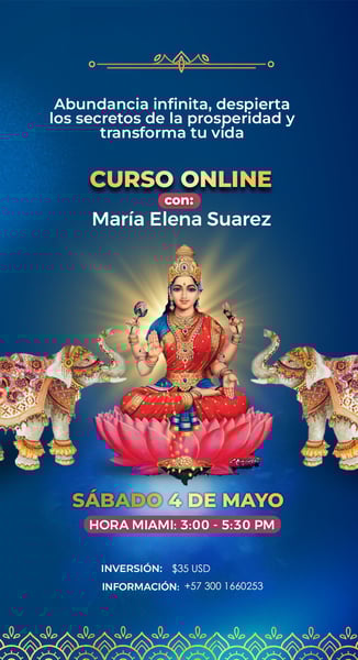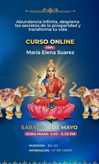 "Estoy emocionada de compartir contigo un camino que transformó mi vida. Pase de vivir en escasez a disfrutar de una abundancia infinita. En mi reciente Viaje a la India y luego de conectar con la energía de la Diosa LAKSHMI quien simboliza abundancia y prosperidad, tanto material como espiritual decidí que era momento de compartir con mi comunidad muchos de los secretos, lecciones y propias experiencias que he recopilado en los últimos años las cuales me han permitido Transformar una vida de miedo y escasez a una vida llena abundancia y prosperidad material y espiritual. Este cambio de entender la energía del dinero pero también lo que significa la verdadera abundancia y prosperidad me han permitieron viajar por el mundo y alcanzar un éxito que nunca imaginé posible a una vida llena de experiencias enriquecedoras. Ahora estoy aquí para guiarte hacia una relación más profunda y enriquecedora con el dinero, desbloqueando juntos las puertas de la prosperidad.